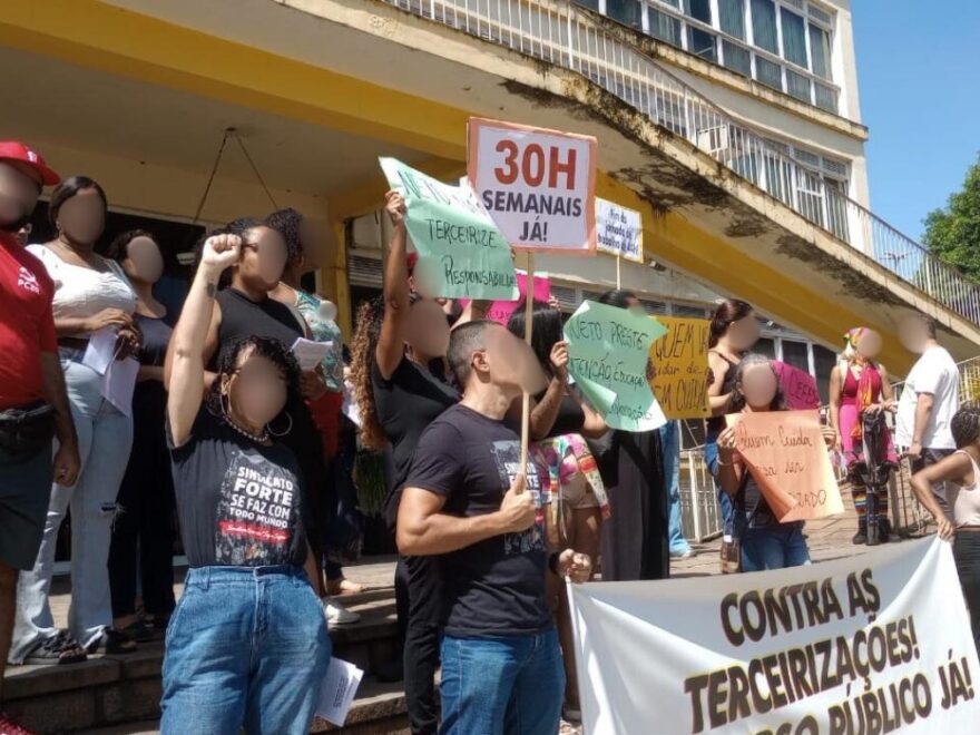 Uma manifestação na Praça da Prefeitura exigiu o rompimento do contrato de terceirização dos cuidadores educacionais e a garantia de concurso público imediato.